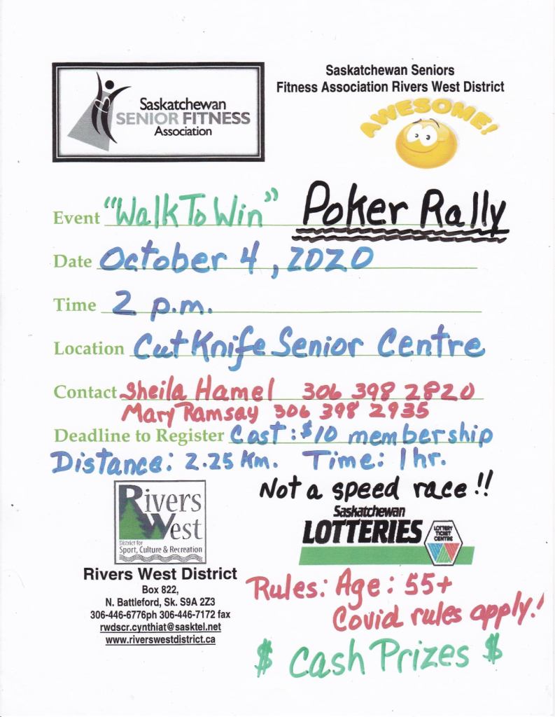 The “Walk-to-Win” Poker Rally for those 55 yrs+ will cover 2.25 kms within a 1 hour time limit. Covid-19 rules apply.