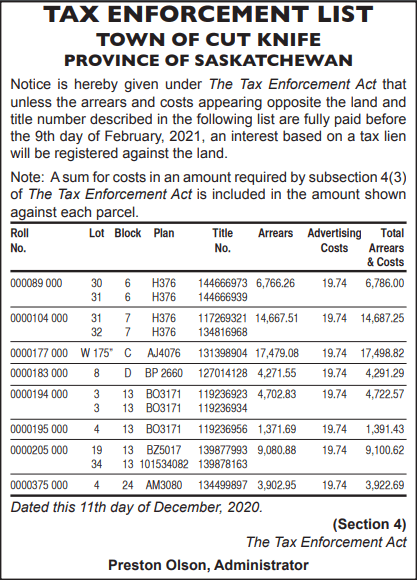 Notice is hereby given under The Tax Enforcement Act that unless the arrears and costs appearing opposite the land and title number described in the following list are fully paid before the 9th day of February, 2021, an interest based on a tax lien will be registered against the land.