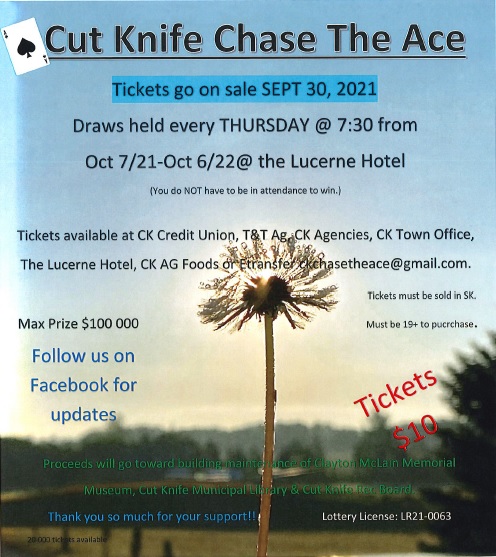 Cut Knife Chase the Ace is a fundraiser for the Cut Knife & District Recreation Board, the Cut Knife Library, and the Clayton McLain Memorial Museum.