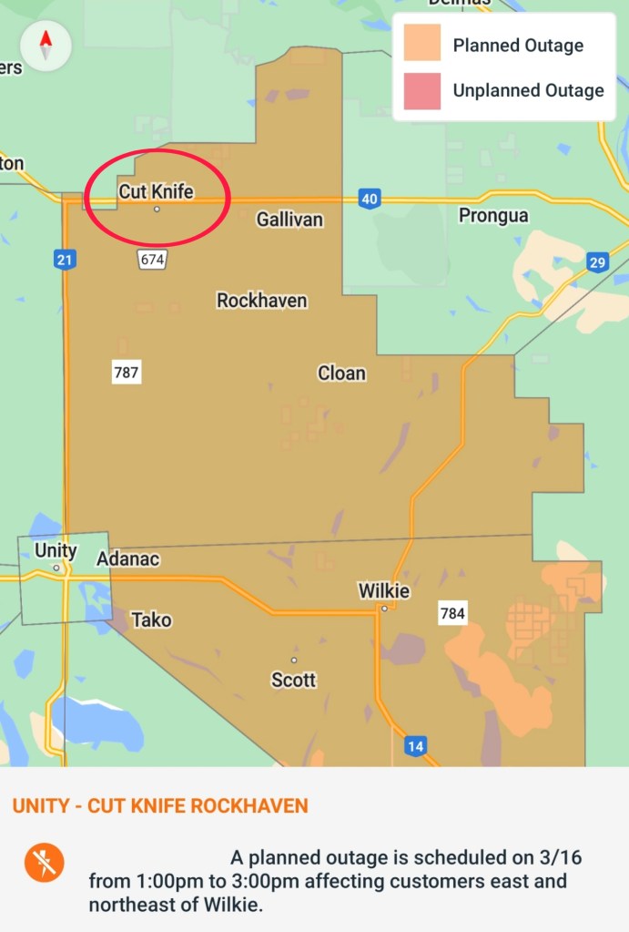 Sask Power has planned a power outage for tomorrow (March 16) from 1:00 PM to 3:00 PM which will affect the surrounding area. Please be prepared accordingly. If you have any questions please call the Sask Power Support Line at 1-888-757-6937. View the map below.