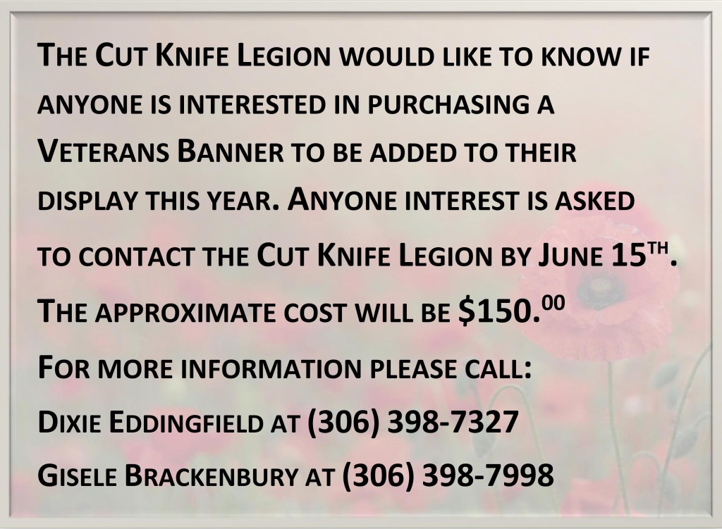 CK Legion – Veteran Banner Inquiry by Town of Cut Knife Posted on April 6, 2023 A message from the Cut Knife Legion: Share this: Click to share on Facebook (Opens in new window) Facebook Click to share on X (Opens in new window) X Click to share on LinkedIn (Opens in new window) LinkedIn Click to email a link to a friend (Opens in new window) Email Click to print (Opens in new window) Print Like Loading... Related