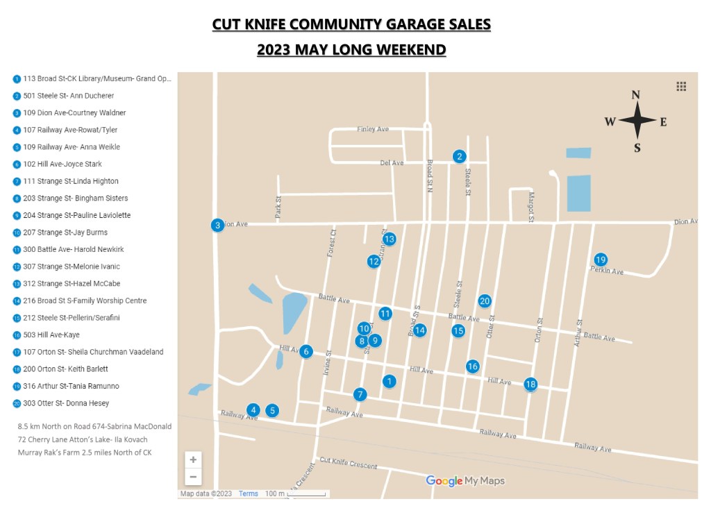 2023 Cut Knife Community Garage Sale Map by Town of Cut Knife Posted on May 15, 2023 CK Community Garage Sale map for this upcoming long weekend. Thanks to Colton Stapley for organizing and creating the map. Share this: Click to share on Facebook (Opens in new window) Facebook Click to share on X (Opens in new window) X Click to share on LinkedIn (Opens in new window) LinkedIn Click to email a link to a friend (Opens in new window) Email Click to print (Opens in new window) Print Like Loading... Related
