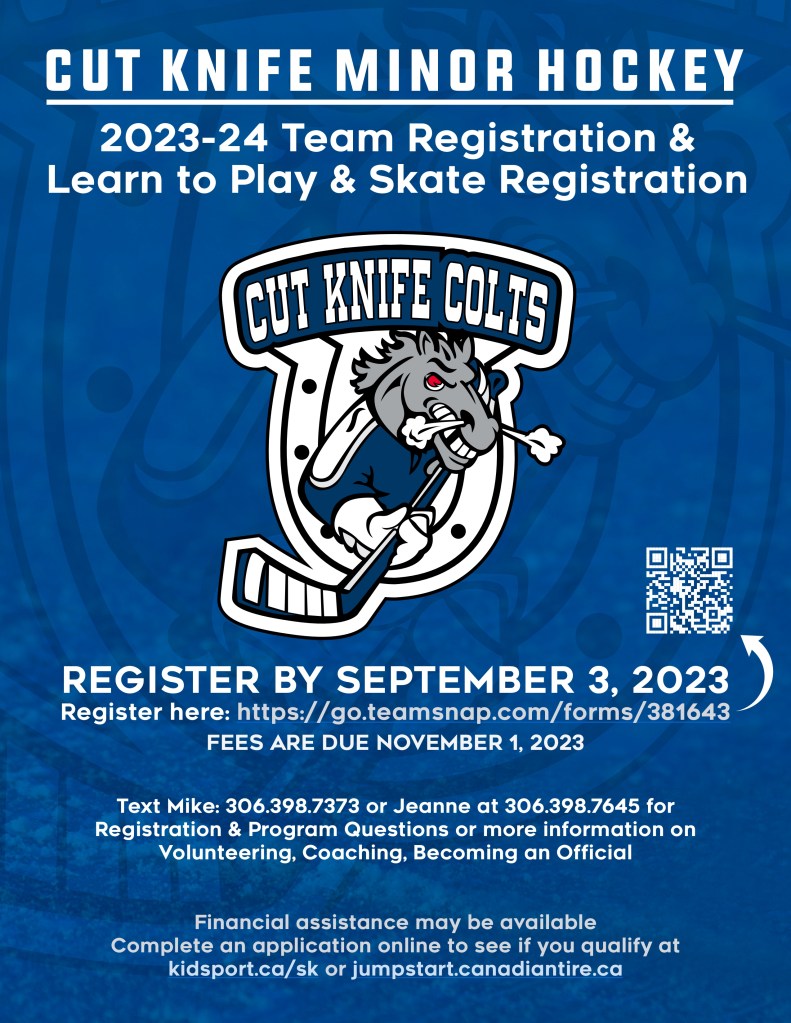 Cut Knife Minor Hockey 2023-24 Registration by Town of Cut Knife Posted on August 2, 2023 A message from Cut Knife Minor Hockey: Click here for online registration: https://go.teamsnap.com/forms/381643 Share this: Click to share on Facebook (Opens in new window) Facebook Click to share on X (Opens in new window) X Click to share on LinkedIn (Opens in new window) LinkedIn Click to email a link to a friend (Opens in new window) Email Click to print (Opens in new window) Print Like Loading... Related