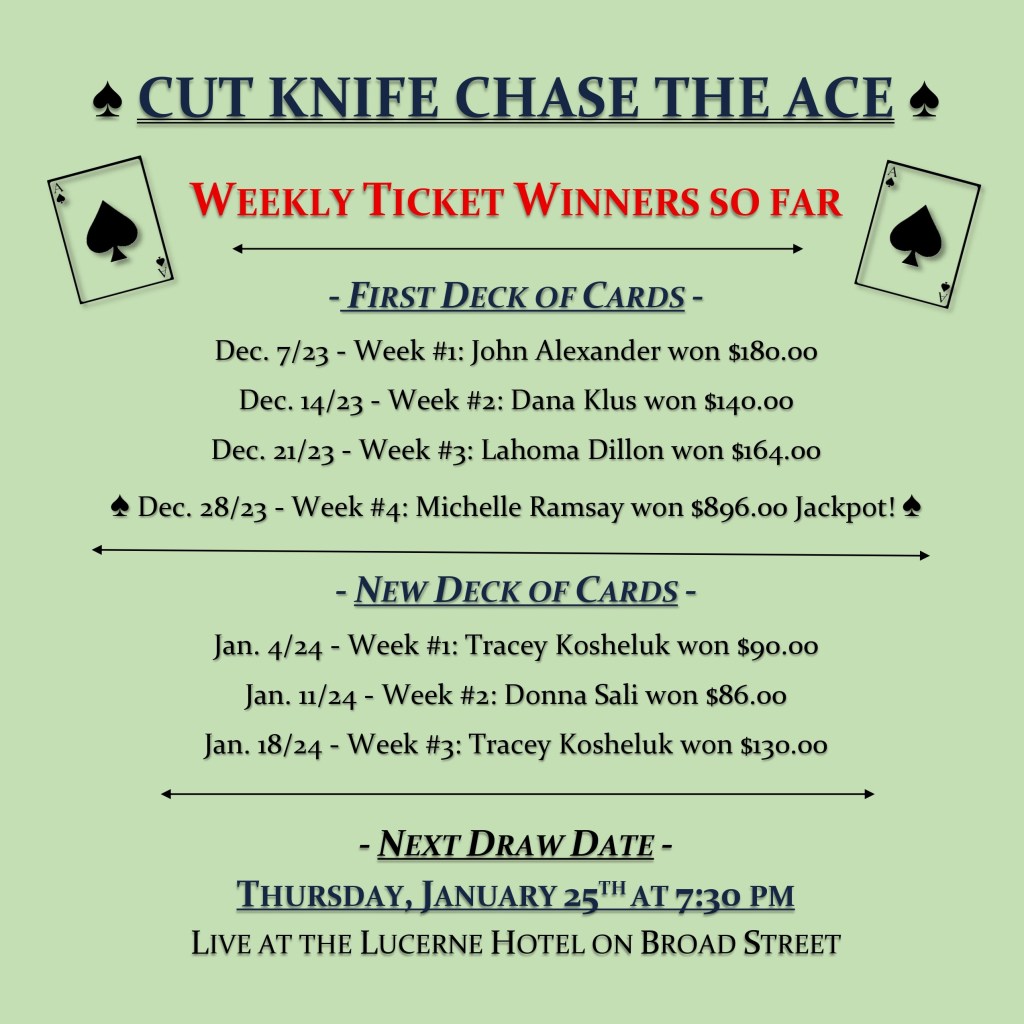Take a chance and have your name next on the list by purchasing tickets ($10 each) at local businesses or by sending an e-transfer to ckchasetheace@gmail.com. Follow the Cut Knife Chase the Ace Facebook Page to watch the Live Draws every Thursday night at 7:30 PM or stop by the Lucerne bar in person!