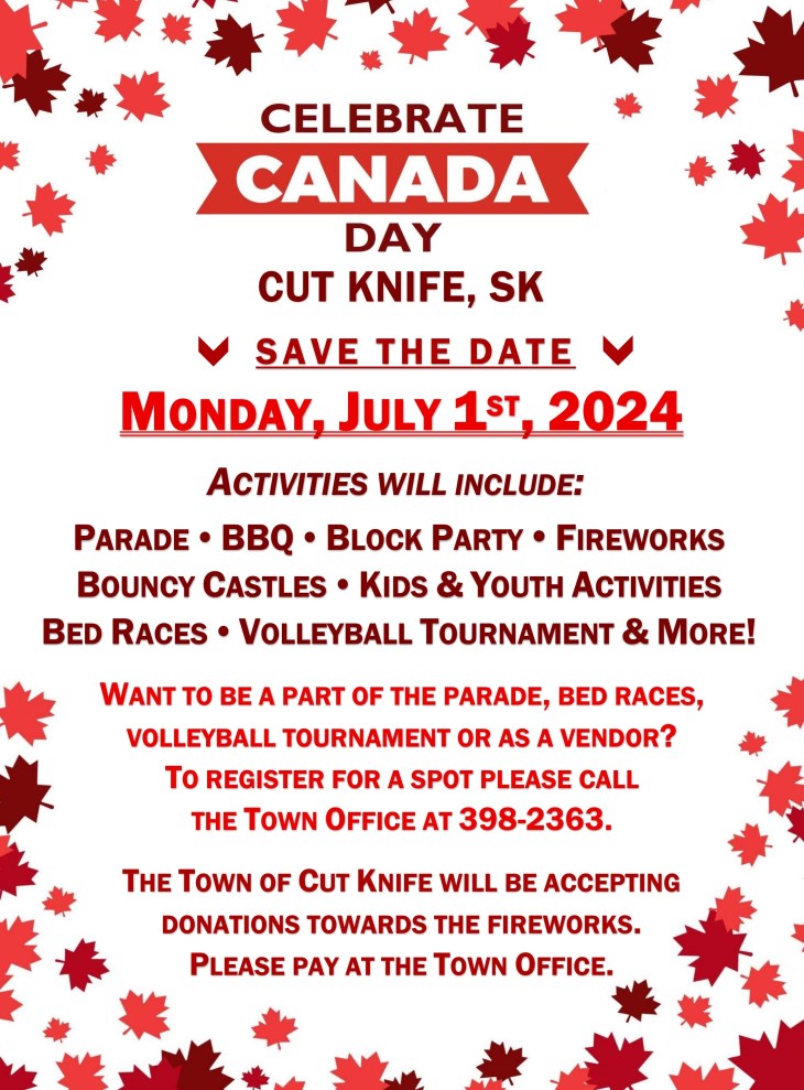 Canada Day lands on a Monday this year and the Town of Cut Knife will be hosting events all day long! Expect more information to be announced shortly.