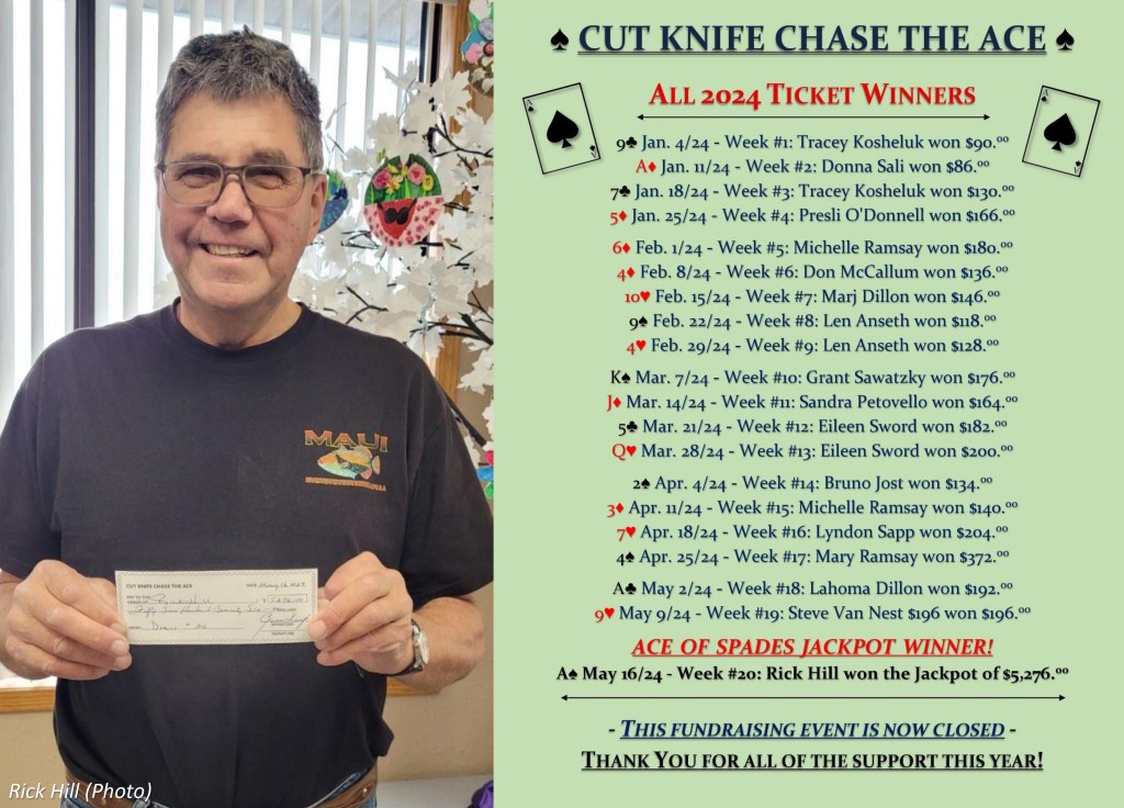 Huge Congratulations to Rick Hill who won the CK Chase The Ace Jackpot of $5,276.00 on May 16th! This fundraising event is now closed and we would like to thank everyone who supported the event.