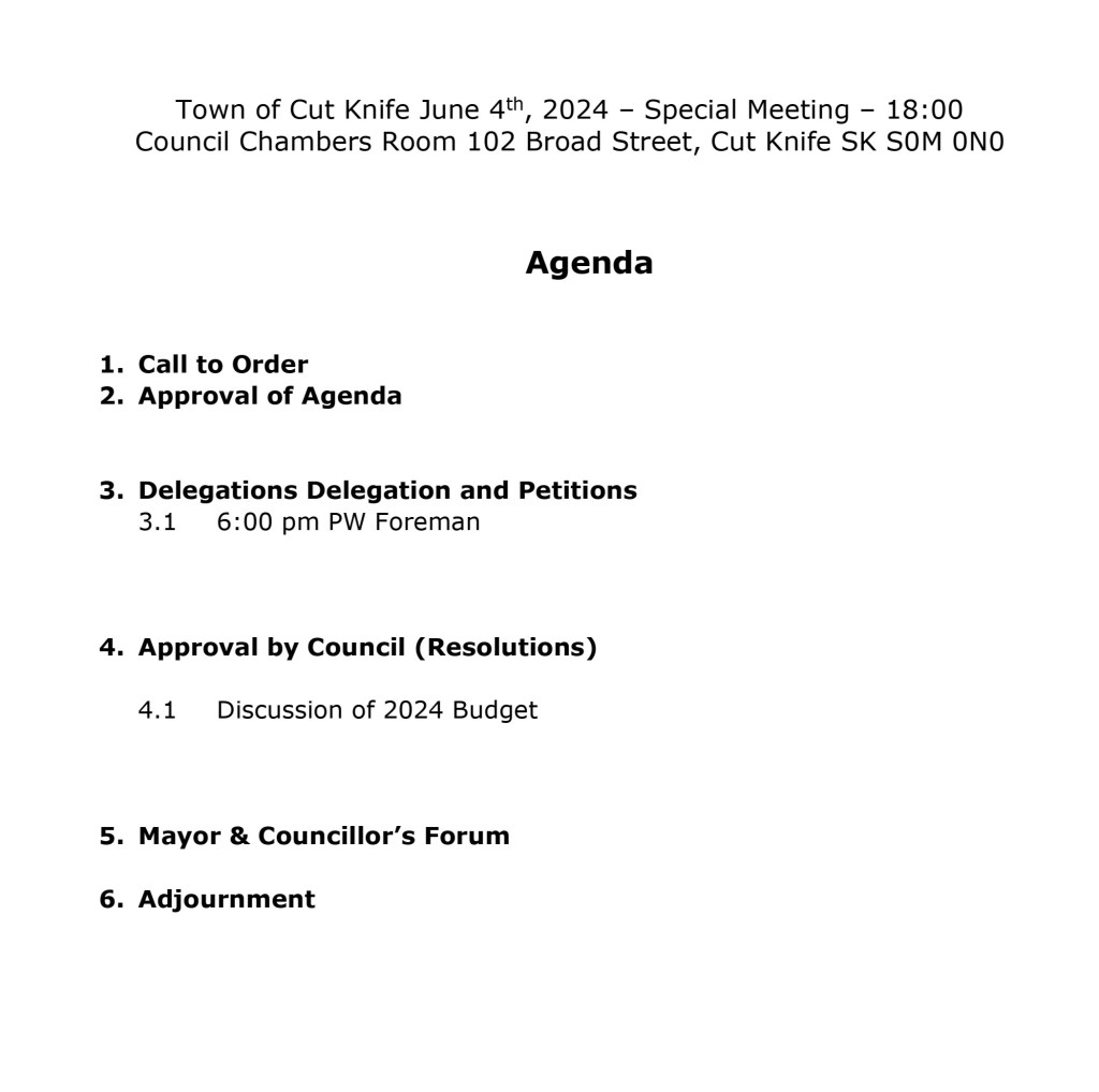 Special Meeting set for June 4, 2024 by Town of Cut Knife Posted on May 24, 2024May 23, 2024 A message from the Town Office of Cut Knife: Share this: Click to share on Facebook (Opens in new window) Facebook Click to share on X (Opens in new window) X Click to share on LinkedIn (Opens in new window) LinkedIn Click to email a link to a friend (Opens in new window) Email Click to print (Opens in new window) Print Like Loading... Related