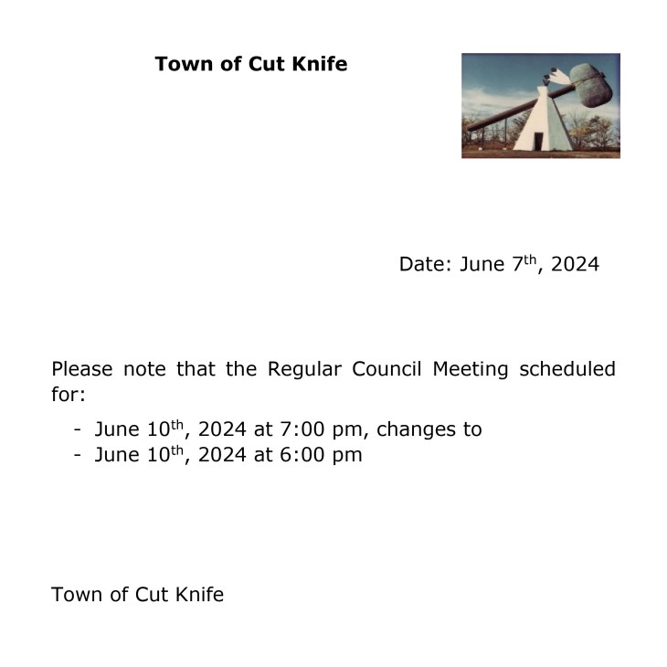Regular Council Meeting time change for June 10, 2024 by Town of Cut Knife Posted on June 7, 2024 A message from the Town Office of Cut Knife: Share this: Share on Facebook (Opens in new window) Facebook Share on X (Opens in new window) X Share on LinkedIn (Opens in new window) LinkedIn Email a link to a friend (Opens in new window) Email Print (Opens in new window) Print Like Loading... Related