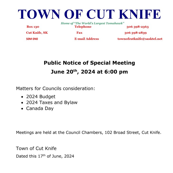 Special Meeting set for June 20, 2024 by Town of Cut Knife Posted on June 18, 2024 A message from the Town Office of Cut Knife: Share this: Click to share on Facebook (Opens in new window) Facebook Click to share on X (Opens in new window) X Click to share on LinkedIn (Opens in new window) LinkedIn Click to email a link to a friend (Opens in new window) Email Click to print (Opens in new window) Print Like Loading... Related