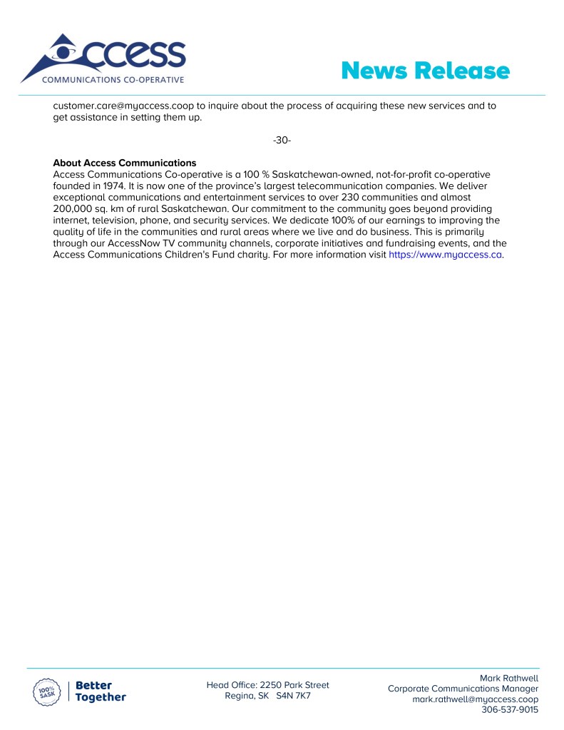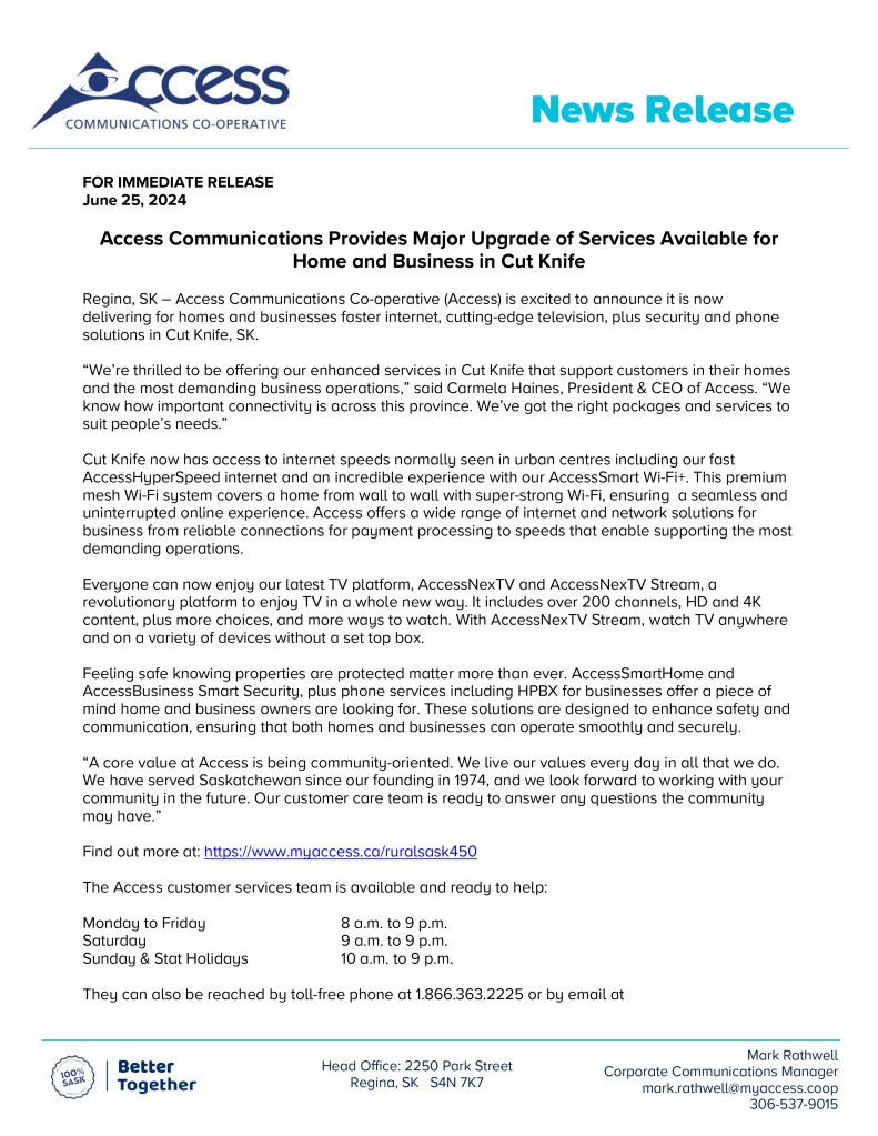 Access Communications News Release – Town Enhanced Services for Cut Knife by Town of Cut Knife Posted on June 25, 2024 A message from Access Communications: Share this: Click to share on Facebook (Opens in new window) Facebook Click to share on X (Opens in new window) X Click to share on LinkedIn (Opens in new window) LinkedIn Click to email a link to a friend (Opens in new window) Email Click to print (Opens in new window) Print Like Loading... Related