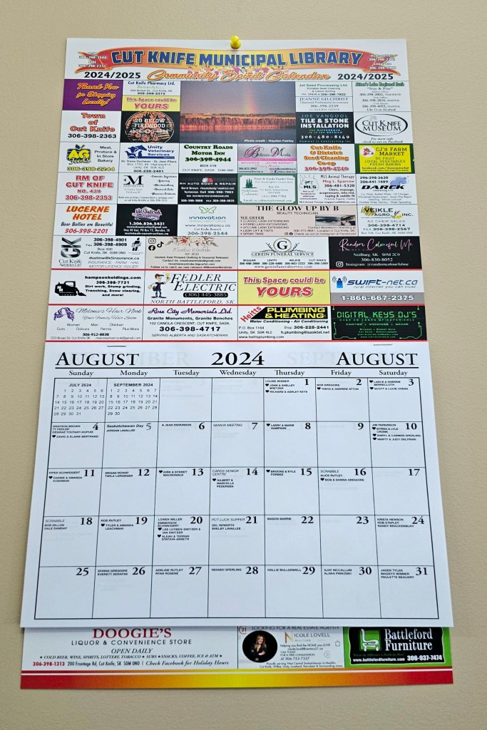 It’s August, which means the Cut Knife Community Calendars are available! You can pick up a prepaid calendar or purchase one for $14 cash at the Cut Knife Town Office or Cut Knife Municipal Library.