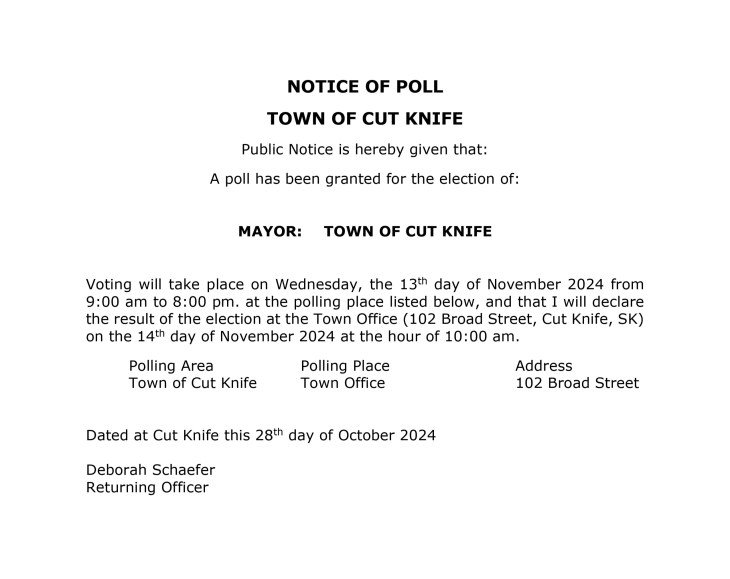 Notice of Poll. Voting will take place on Wednesday, the 13th day of November 2024 from 9:00 am to 8:00 pm at the Cut Knife Town Office. Please note: The Town Office will be closed the entire day of the Poll, however the Town Office Council Chambers will be open for voting from 9:00 am to 8:00 pm.