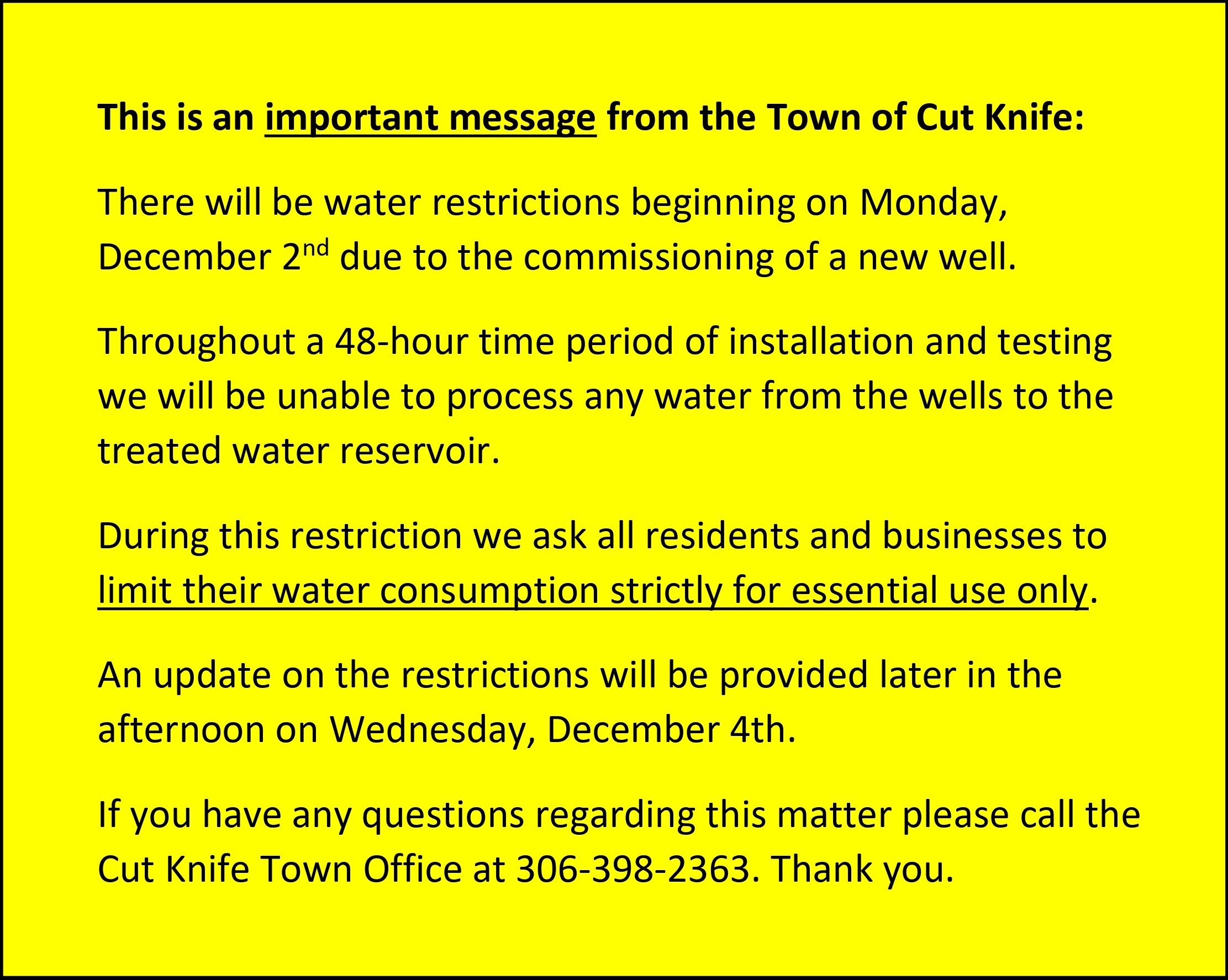 UPDATE: Water Restrictions Begin (Dec. 2 – 4) by Town of Cut Knife Posted on December 2, 2024 An important message from the Town of Cut Knife: Click here to the the .pdf file. Share this: Click to share on Facebook (Opens in new window) Facebook Click to share on X (Opens in new window) X Click to share on LinkedIn (Opens in new window) LinkedIn Click to email a link to a friend (Opens in new window) Email Click to print (Opens in new window) Print Like Loading... Related