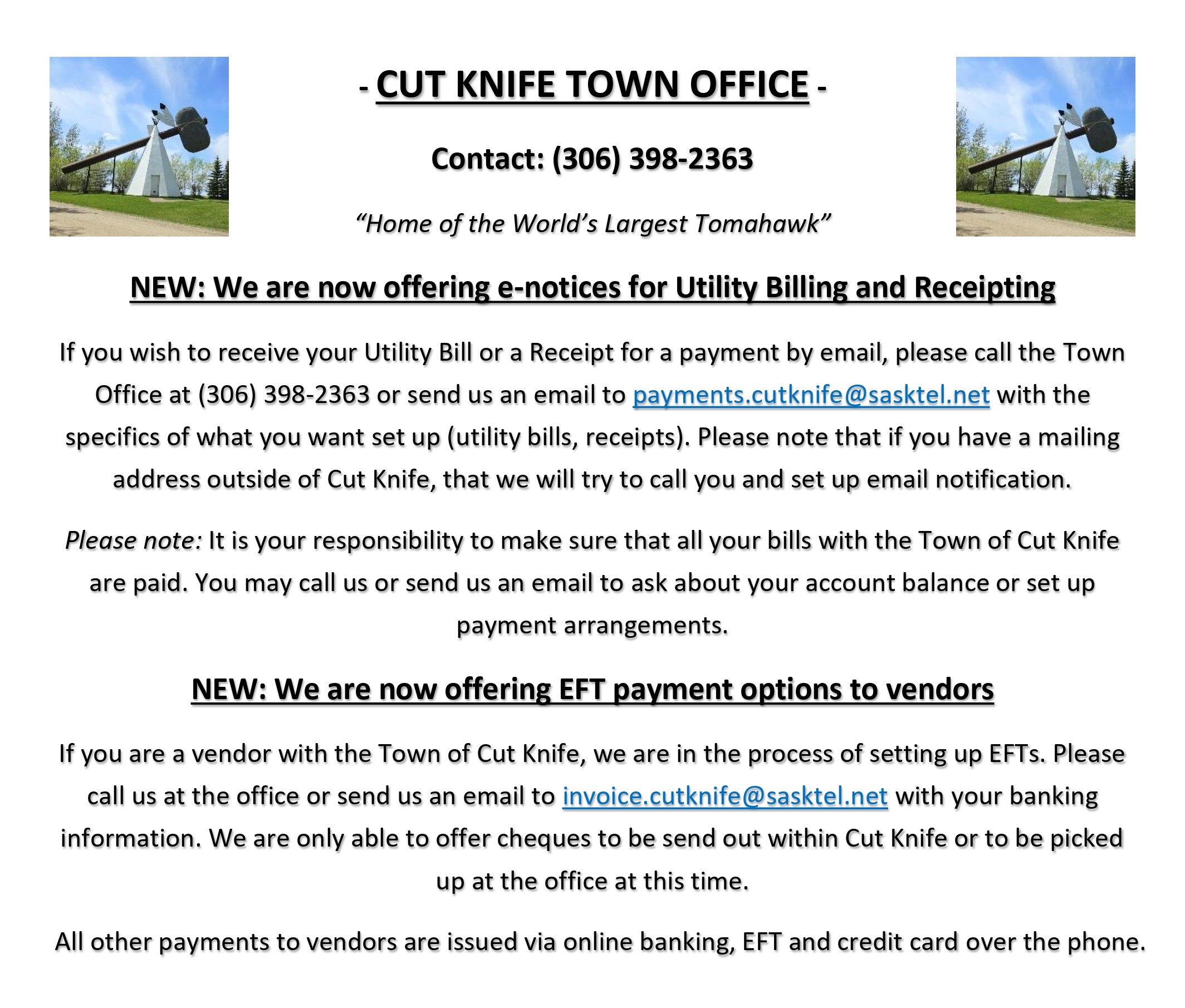 Cut Knife Town Office – eNotice Update by Town of Cut Knife Posted on December 17, 2024 A message from the Cut Knife Town Office: Click here to the the .pdf file. Share this: Click to share on Facebook (Opens in new window) Facebook Click to share on X (Opens in new window) X Click to share on LinkedIn (Opens in new window) LinkedIn Click to email a link to a friend (Opens in new window) Email Click to print (Opens in new window) Print Like Loading... Related