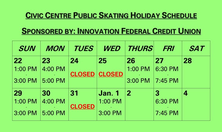 Civic Centre Public Skating Holiday Schedule by Town of Cut Knife Posted on December 19, 2024December 19, 2024 A message from the Cut Knife Civic Centre: Share this: Click to share on Facebook (Opens in new window) Facebook Click to share on X (Opens in new window) X Click to share on LinkedIn (Opens in new window) LinkedIn Click to email a link to a friend (Opens in new window) Email Click to print (Opens in new window) Print Like Loading... Related