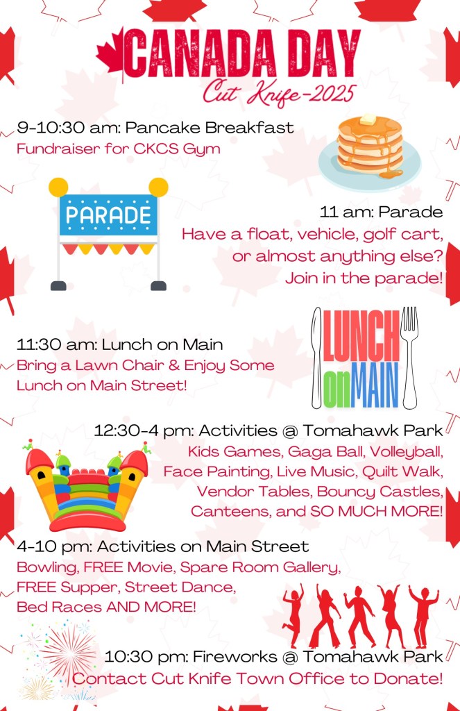 Canada Day lands on a Tuesday this year and the Town of Cut Knife will be hosting events all day long! Expect more information to be announced shortly.