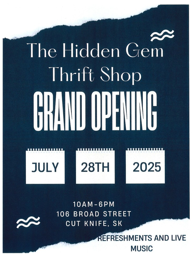 A new business will be opening up in Cut Knife on Monday, July 28th! The Hidden Gem Thrift Shop is located on 106 Broad Street (North of the Town Office) and they will offering refreshments and live music from 10:00 AM to 6:00 PM. Stop in to say Hi to Marian and do some shopping.