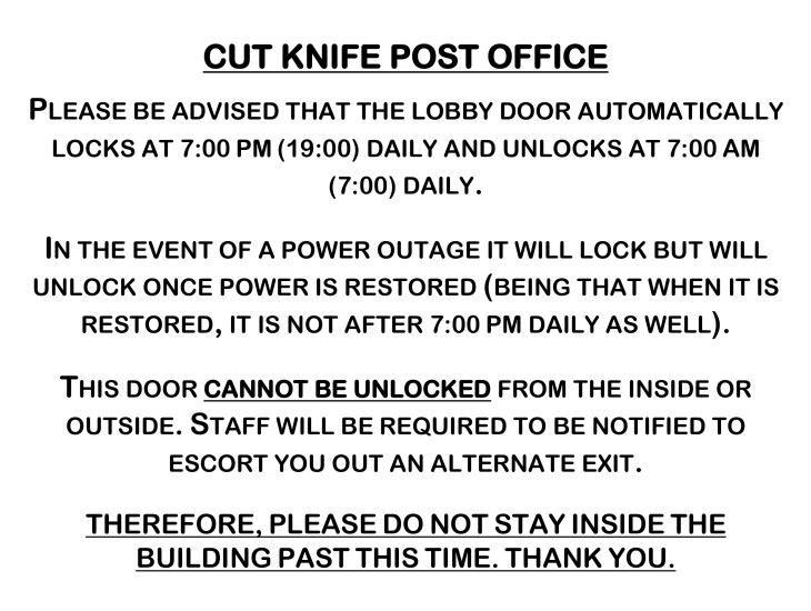 Cut Knife Post Office Advisory Sign by Town of Cut Knife Posted on August 14, 2025August 13, 2025 A message from the Cut Knife Post Office: Share this: Click to share on Facebook (Opens in new window) Facebook Click to share on X (Opens in new window) X Click to share on LinkedIn (Opens in new window) LinkedIn Click to email a link to a friend (Opens in new window) Email Click to print (Opens in new window) Print Like Loading... Related
