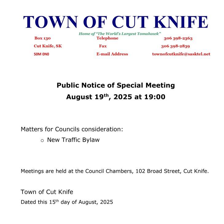 Special Meeting set for August 19, 2025 by Town of Cut Knife Posted on August 18, 2025 A message from the Town Office of Cut Knife: Click here to view the .pdf file. Share this: Share on Facebook (Opens in new window) Facebook Share on X (Opens in new window) X Share on LinkedIn (Opens in new window) LinkedIn Email a link to a friend (Opens in new window) Email Print (Opens in new window) Print Like Loading... Related