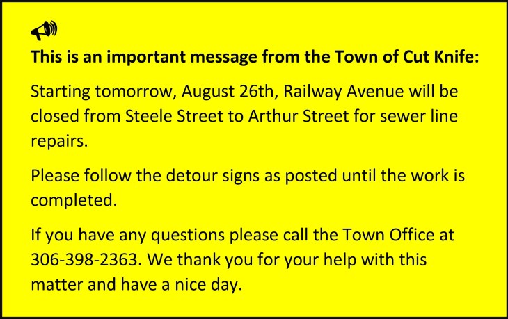 Notice: Sewer Line Repairs on Railway Avenue by Town of Cut Knife Posted on August 25, 2025 An important message from the Town of Cut Knife: Click here to view the .pdf file. Share this: Click to share on Facebook (Opens in new window) Facebook Click to share on X (Opens in new window) X Click to share on LinkedIn (Opens in new window) LinkedIn Click to email a link to a friend (Opens in new window) Email Click to print (Opens in new window) Print Like Loading... Related