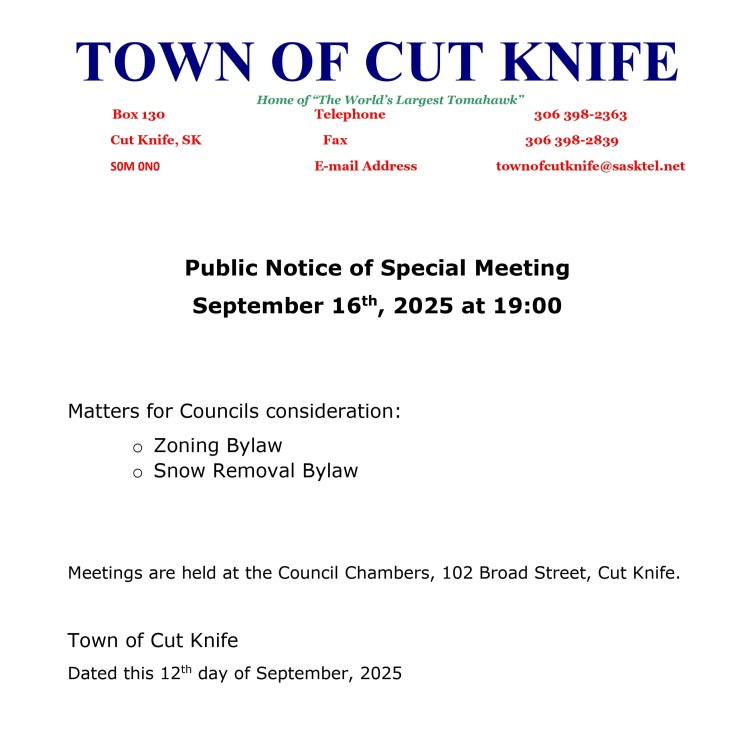 Special Meeting set for September 16, 2025 by Town of Cut Knife Posted on September 12, 2025 A message from the Town Office of Cut Knife: Click here to view the .pdf file. Share this: Click to share on Facebook (Opens in new window) Facebook Click to share on X (Opens in new window) X Click to share on LinkedIn (Opens in new window) LinkedIn Click to email a link to a friend (Opens in new window) Email Click to print (Opens in new window) Print Like Loading... Related