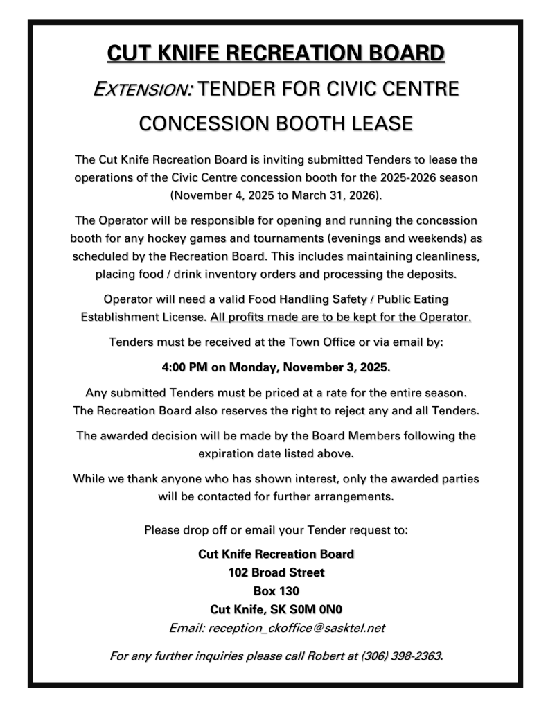Tender for Civic Centre Concession Booth Lease (Extension) by Town of Cut Knife Posted on October 23, 2025 A message from the Cut Knife Recreation Board: Click here to view the .pdf file. Share this: Click to share on Facebook (Opens in new window) Facebook Click to share on X (Opens in new window) X Click to share on LinkedIn (Opens in new window) LinkedIn Click to email a link to a friend (Opens in new window) Email Click to print (Opens in new window) Print Like Loading... Related