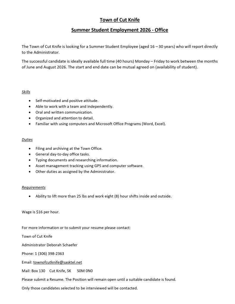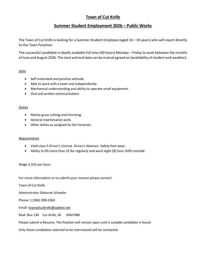 There are 2 full time summer student positions available for the Town of Cut Knife. One position is for the Public Works Department and the other is for the Town Office. Note: For any applicants please indicate which position you will be applying for. Thank you.