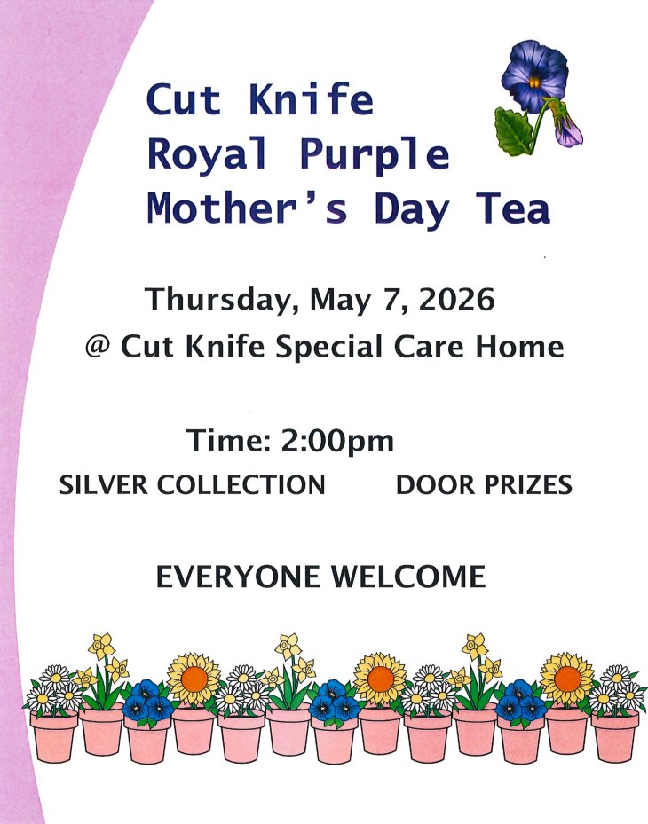 Cut Knife Royal Purple Mother’s Day Tea (May 7th) by Town of Cut Knife Posted on April 28, 2026 A message from the Cut Knife Royal Purple: Share this: Share on Facebook (Opens in new window) Facebook Share on X (Opens in new window) X Share on LinkedIn (Opens in new window) LinkedIn Email a link to a friend (Opens in new window) Email Print (Opens in new window) Print Like Loading... Related