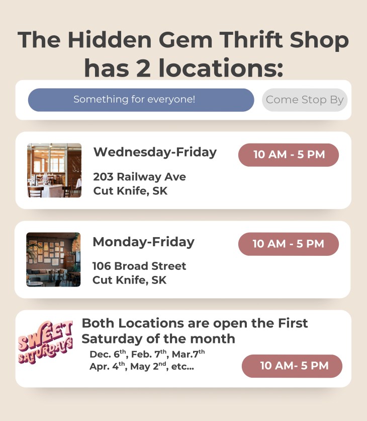 The Hidden Gem Thrift Shop have two locations in Cut Knife and are now also…