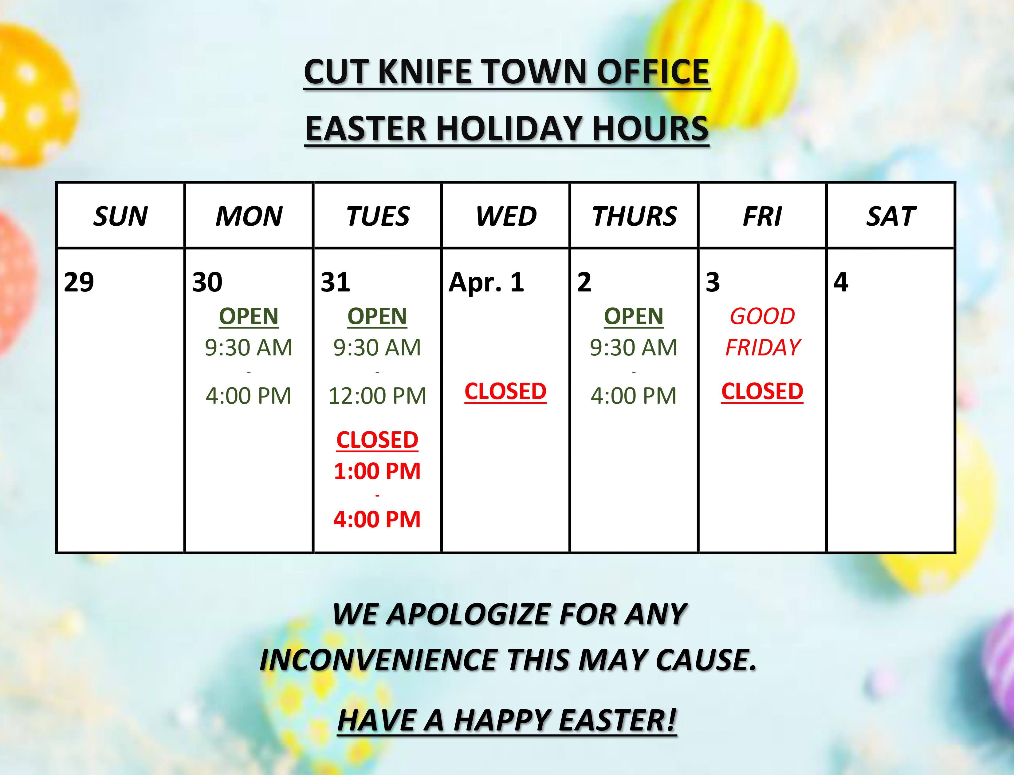 TOWN OF CUT KNIFE 2026 EASTER HOURS 2